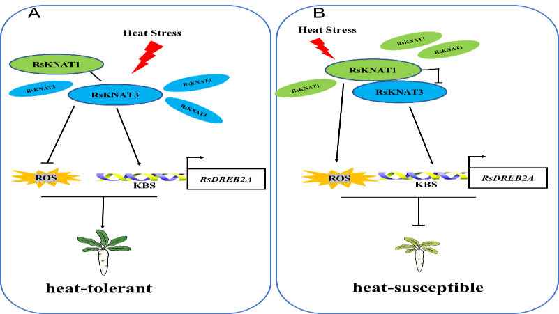 在耐热萝卜基因型中,RsKNAT3表达量显著高于RsKNAT1,RsKNAT3作为转录激活子,通过正调控RsDREB2A表达增强萝卜植株耐热性;在热敏感萝卜基因型中,RsKNAT1表达量高于RsKNAT3,RsKNAT1通过与RsKNAT3互作抑制RsKNAT3对RsDREB2A的激活,降低萝卜植株耐热性(图2)。该研究揭示了RsKNAT3与RsKNAT1相互拮抗调控萝卜耐热性的转录调控机制,研究结果为萝卜耐热性状遗传改良与优异种质创新提供了重要的分子靶标与理论基础。